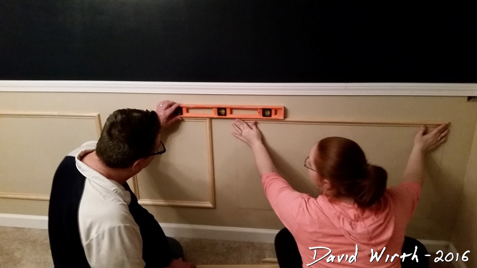 Once the design was finalized and we had all the wood, we started by marking the walls and snapping a chalk line for the chair railing. I was in the basement cutting the boards and Karrie and her dad were upstairs nailing everything to the wall.